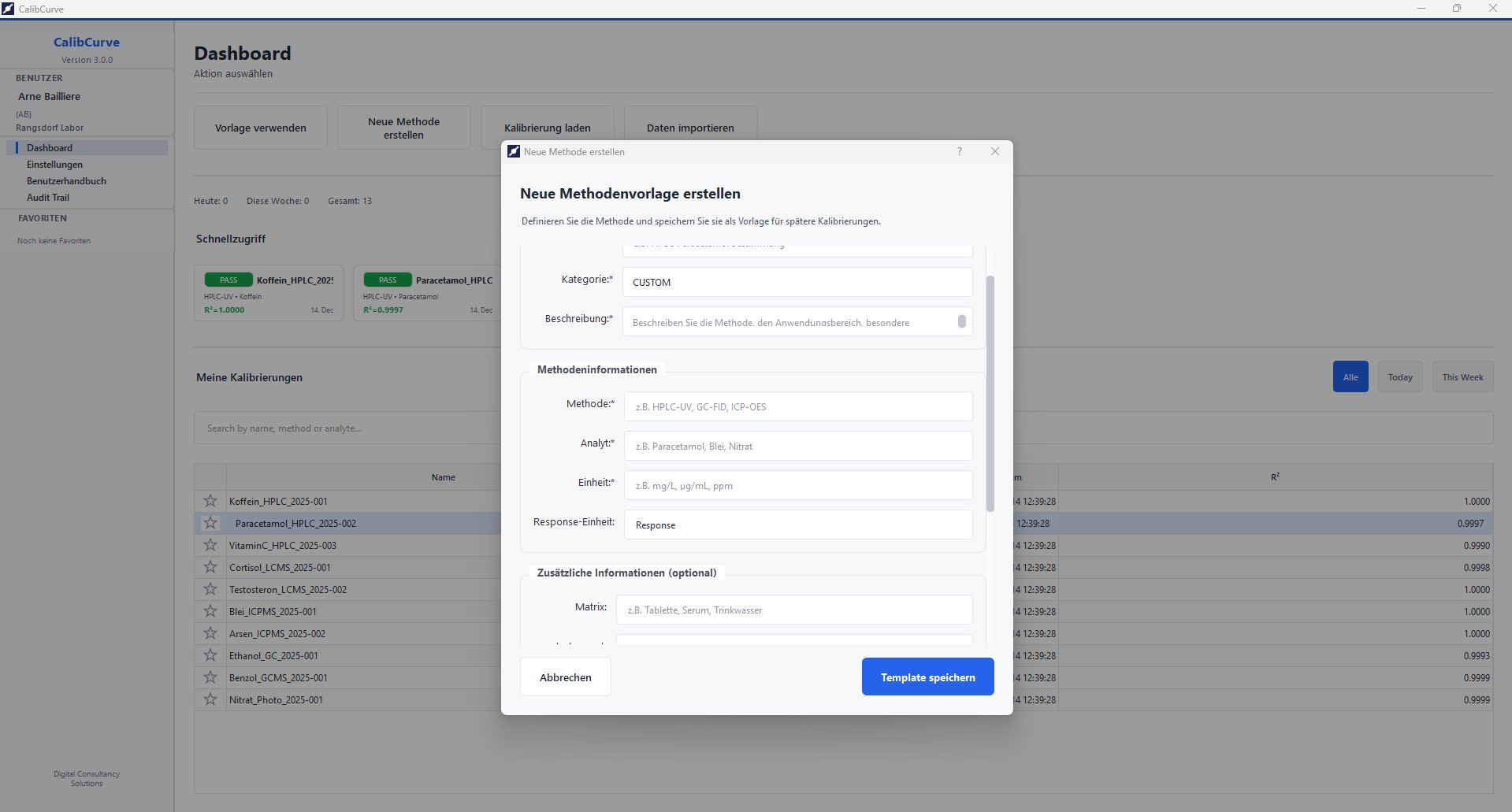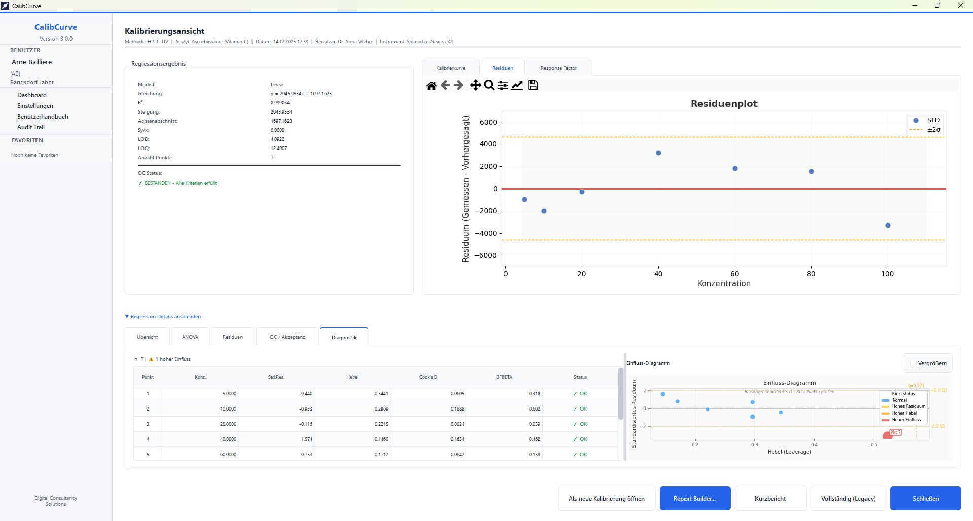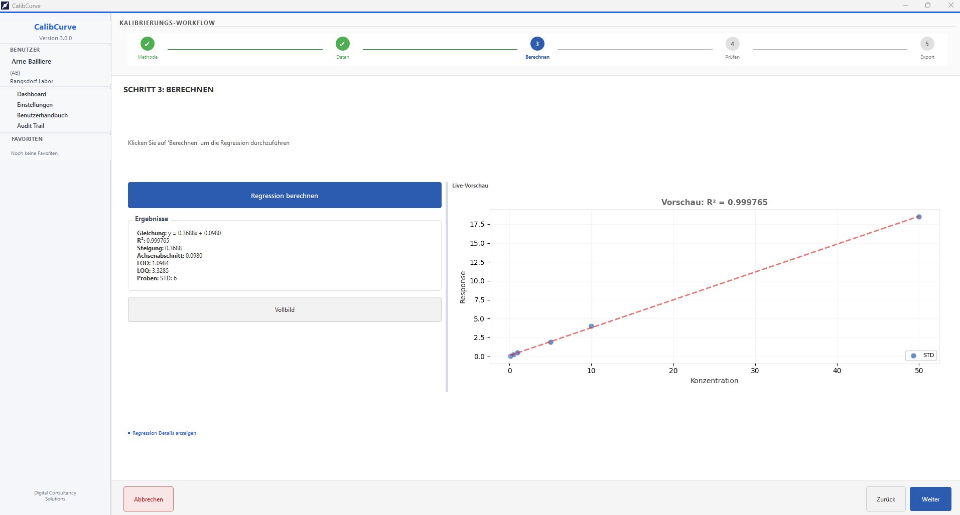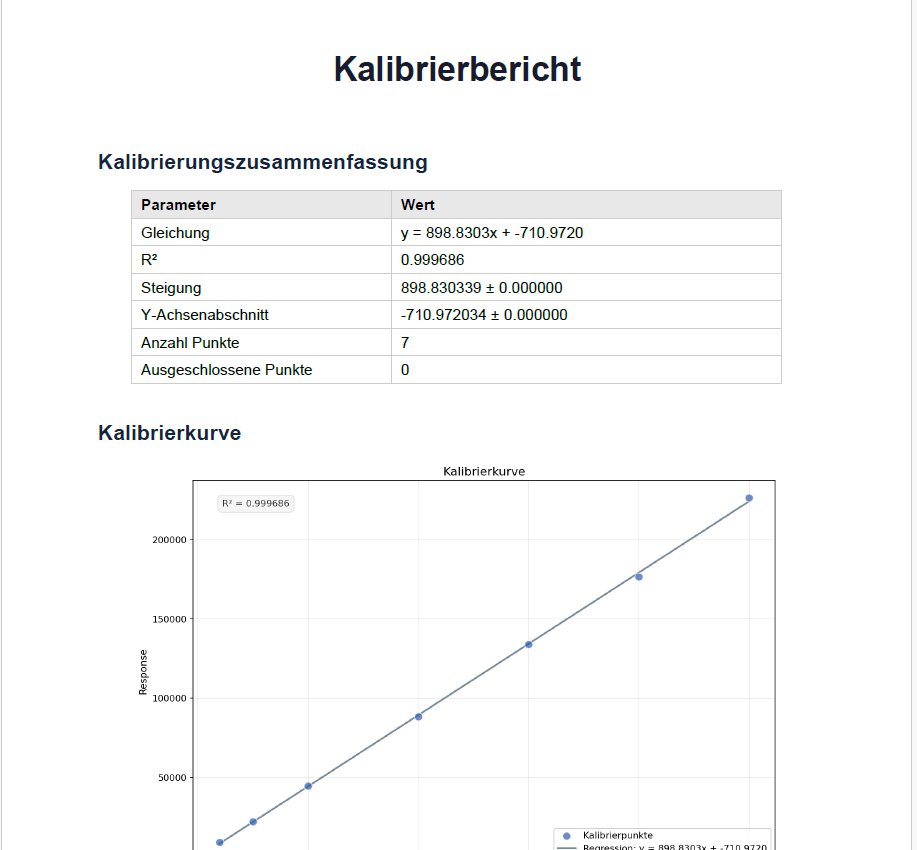 Vollständige Kalibrierkurven-Software für analytische Laboratorien nach GLP/GMP-Anforderungen. Geführter 5-stufiger Workflow von der Methodendefinition bis zum regulatorischen Bericht — mit Audit Trail, statistischer Diagnostik und automatischer PDF-Ausgabe.